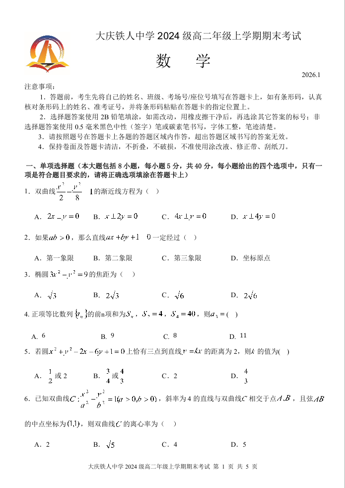 大庆铁人中学2025-2026学年高二上学期期末考试 数学.docx