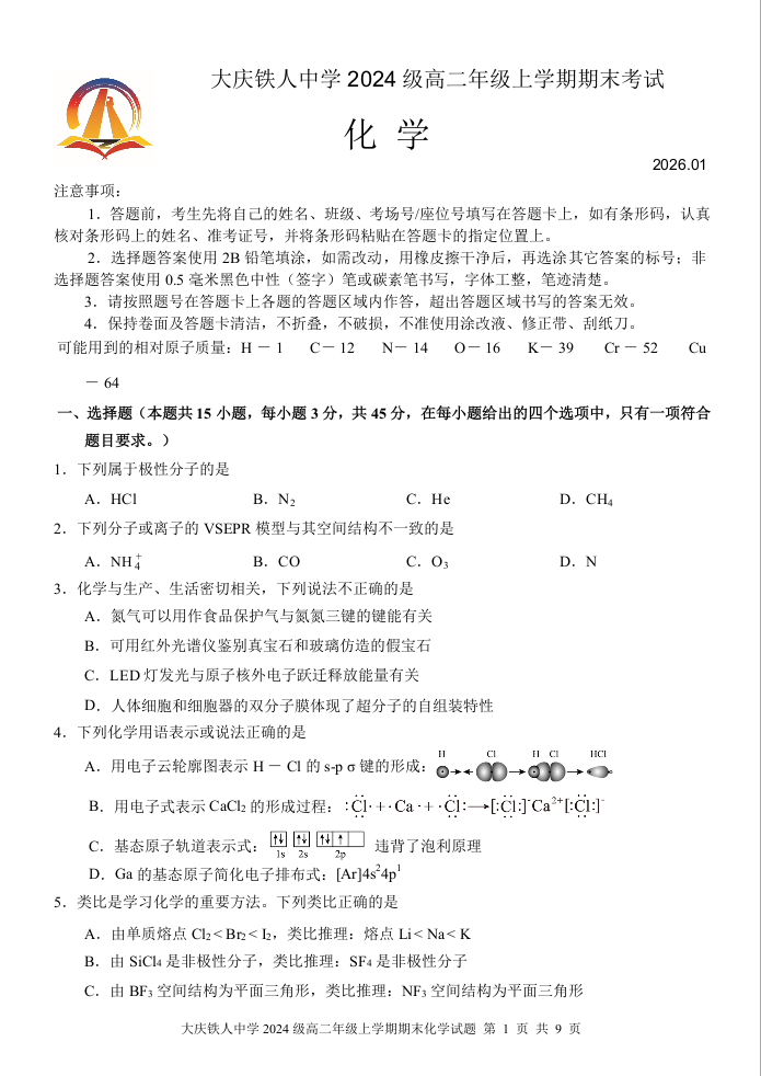 大庆铁人中学2025-2026学年高二上学期期末考试 化学.docx