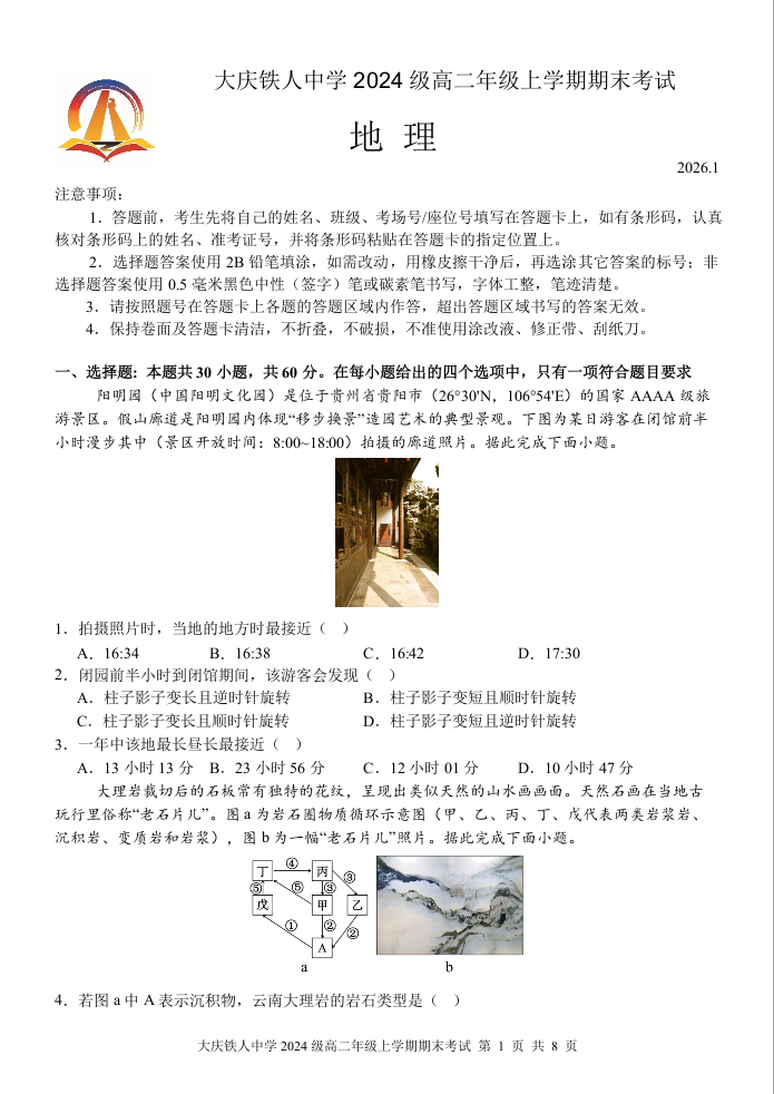 大庆铁人中学2025-2026学年高二上学期期末考试 地理.docx