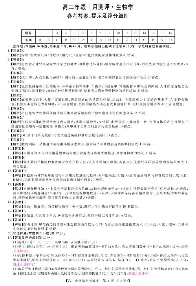 河南省周口市重点高中2025-2026学年高二年级1月测评 生物答案.pdf