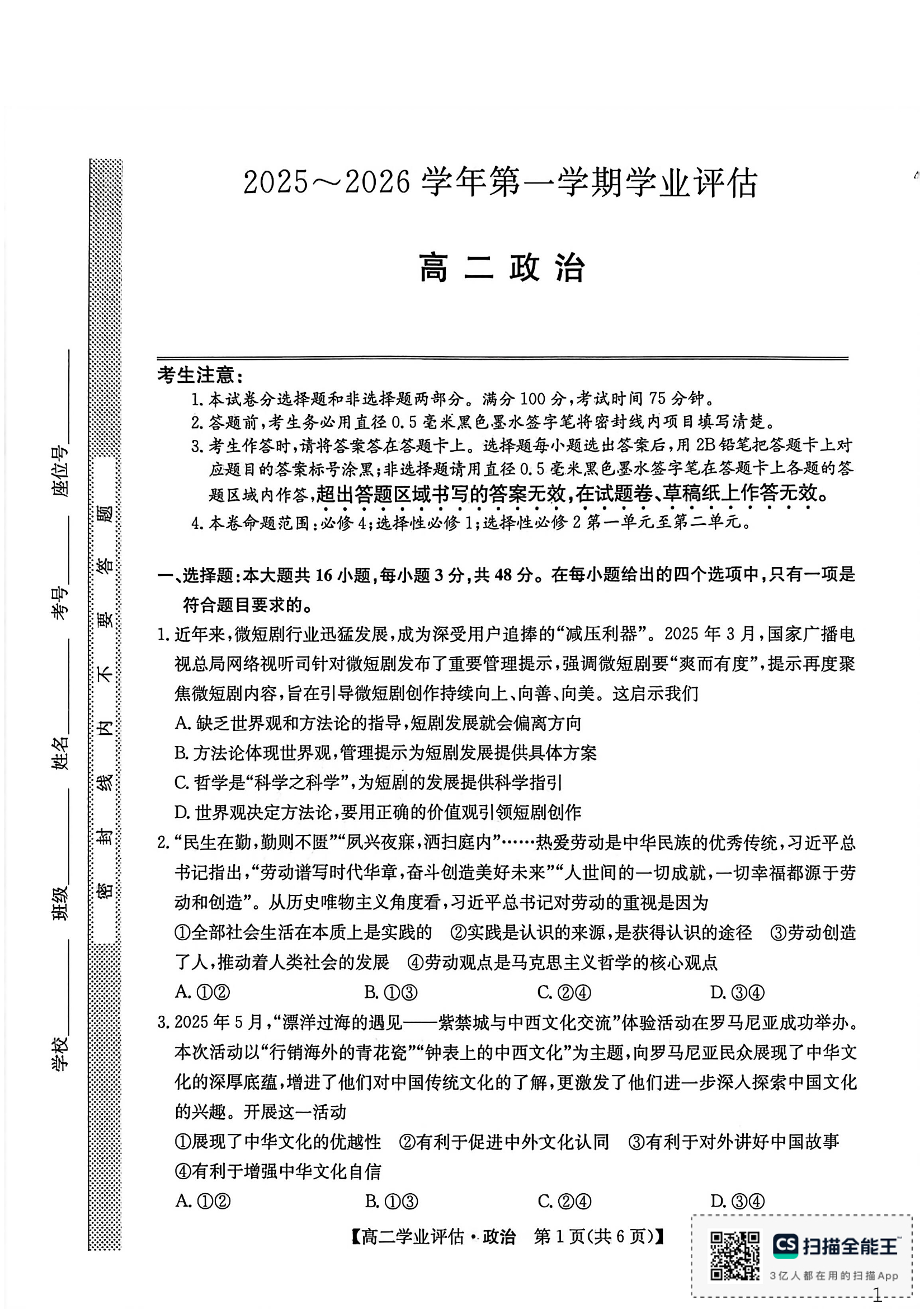 河北省2025-2026学年高二第一学期学业评估 政治.pdf