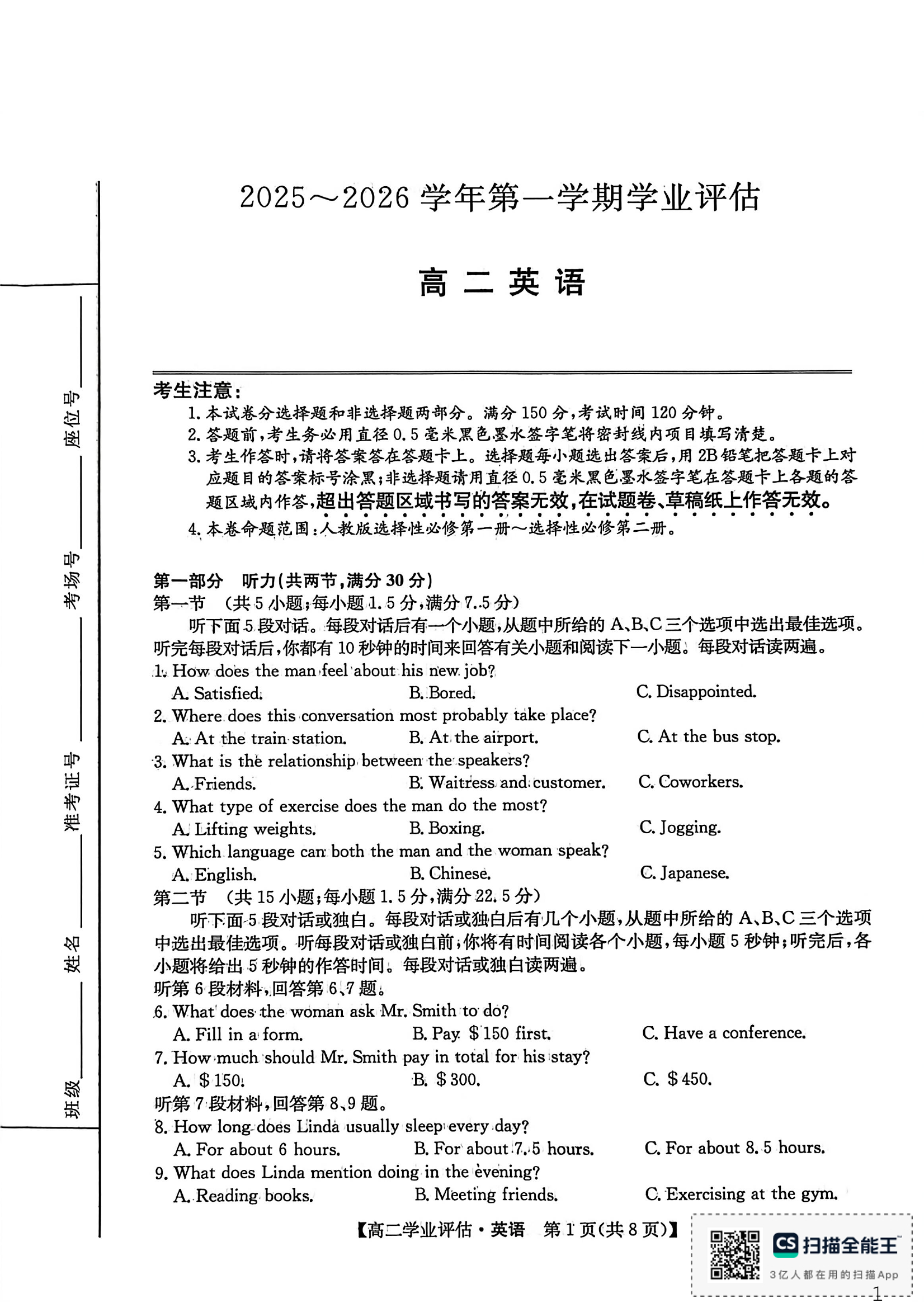 河北省2025-2026学年高二第一学期学业评估 英语.pdf