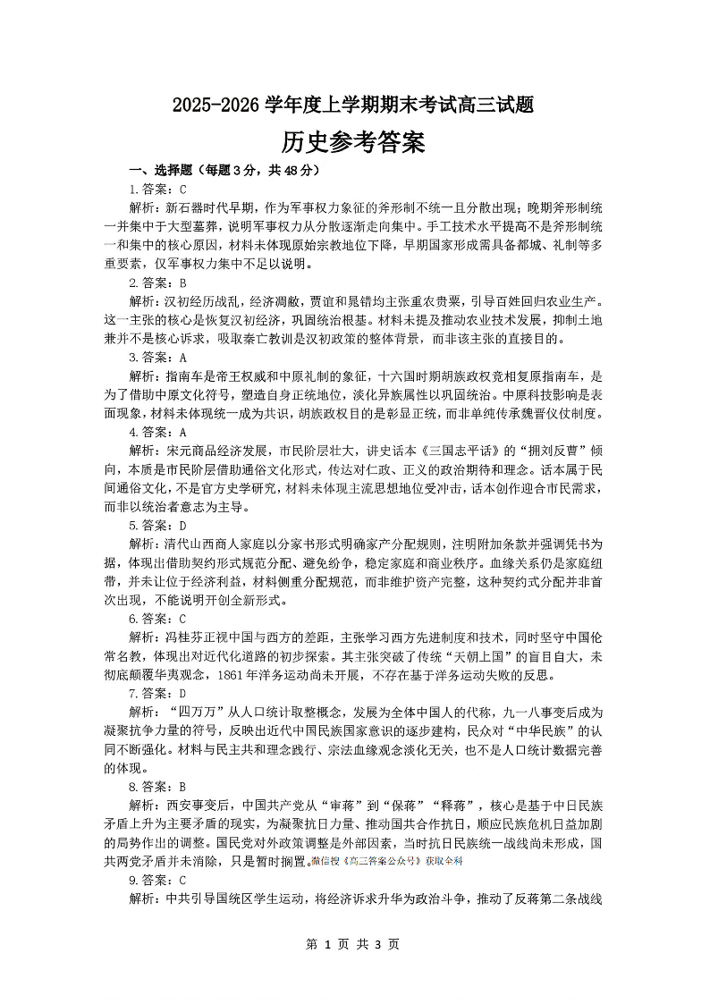 辽宁省协作校2025-2026学年度高三上学期期末考试 历史答案.pdf
