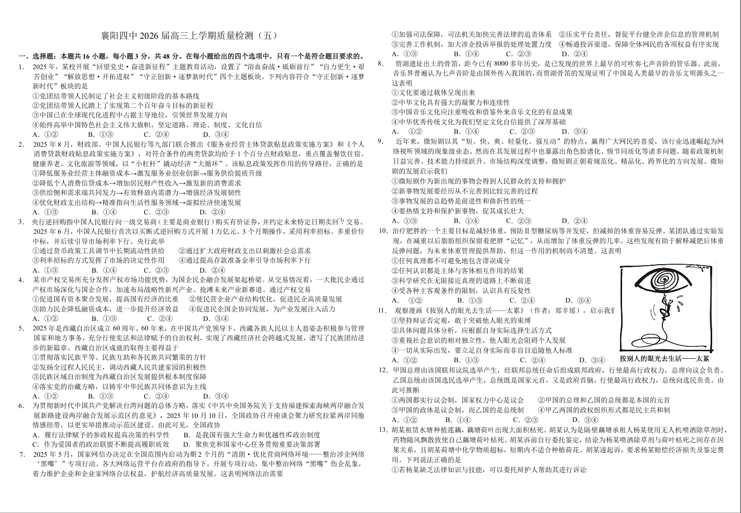 襄阳四中2026届高三上学期质量检测(五)政治试题(含答案).docx