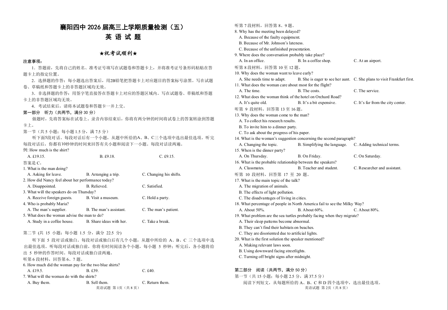 襄阳四中2026届高三上学期质量检测(五)英语试题(含答案).docx
