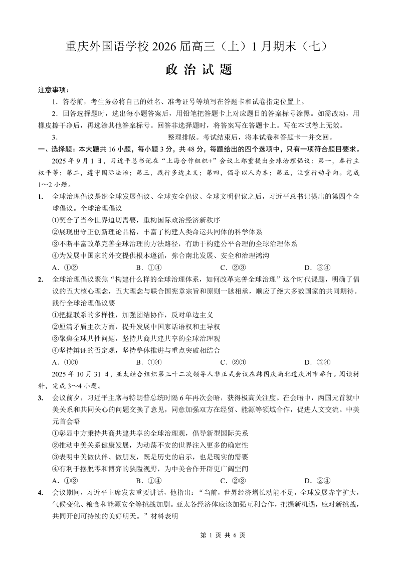 重庆外国语学校2026届高三(上)1月期末(七)政治.pdf