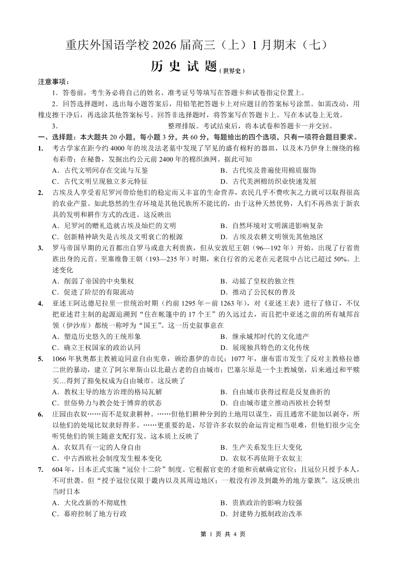 重庆外国语学校2026届高三(上)1月期末(七)历史.pdf