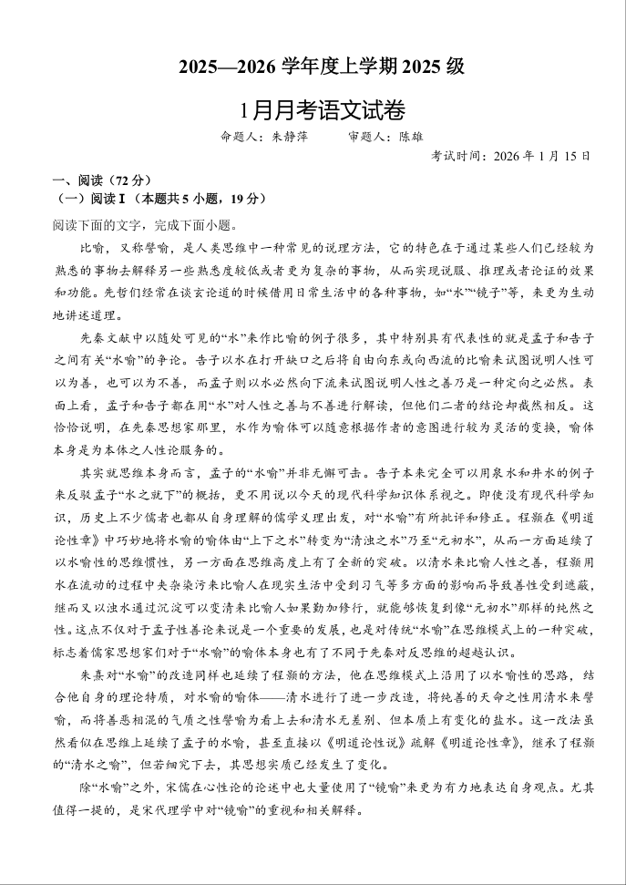 湖北省沙市中学2025-2026学年高一上学期1月月考 语文试题(含答案).docx