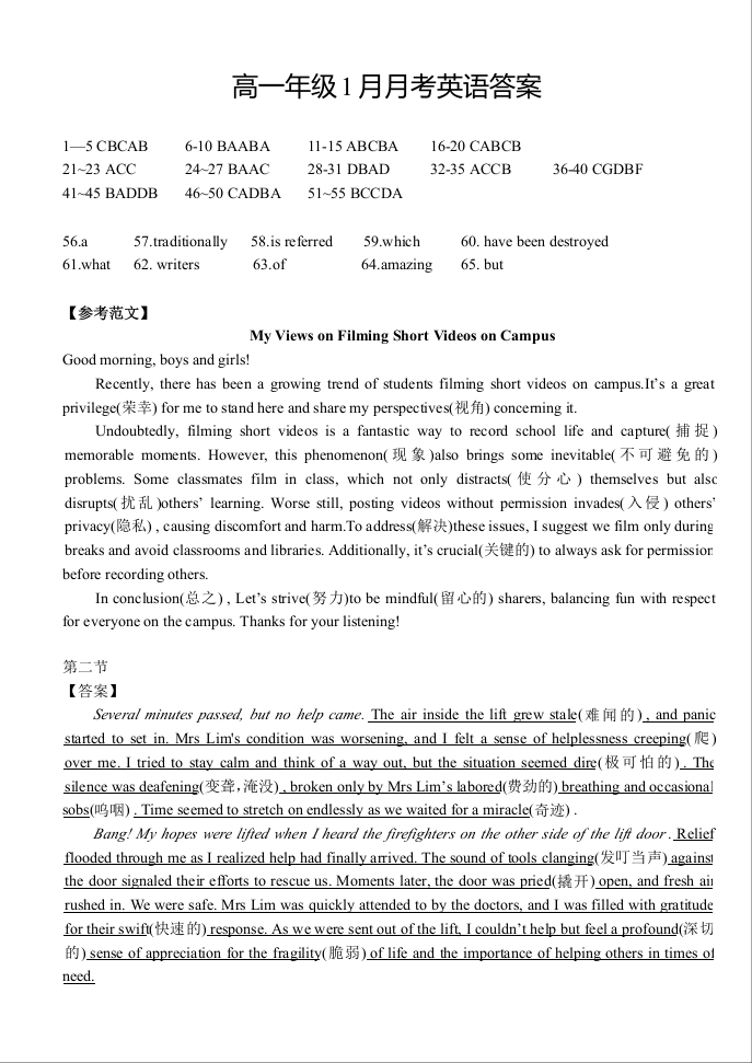 湖北省沙市中学2025-2026学年高一上学期1月月考 英语答案.docx