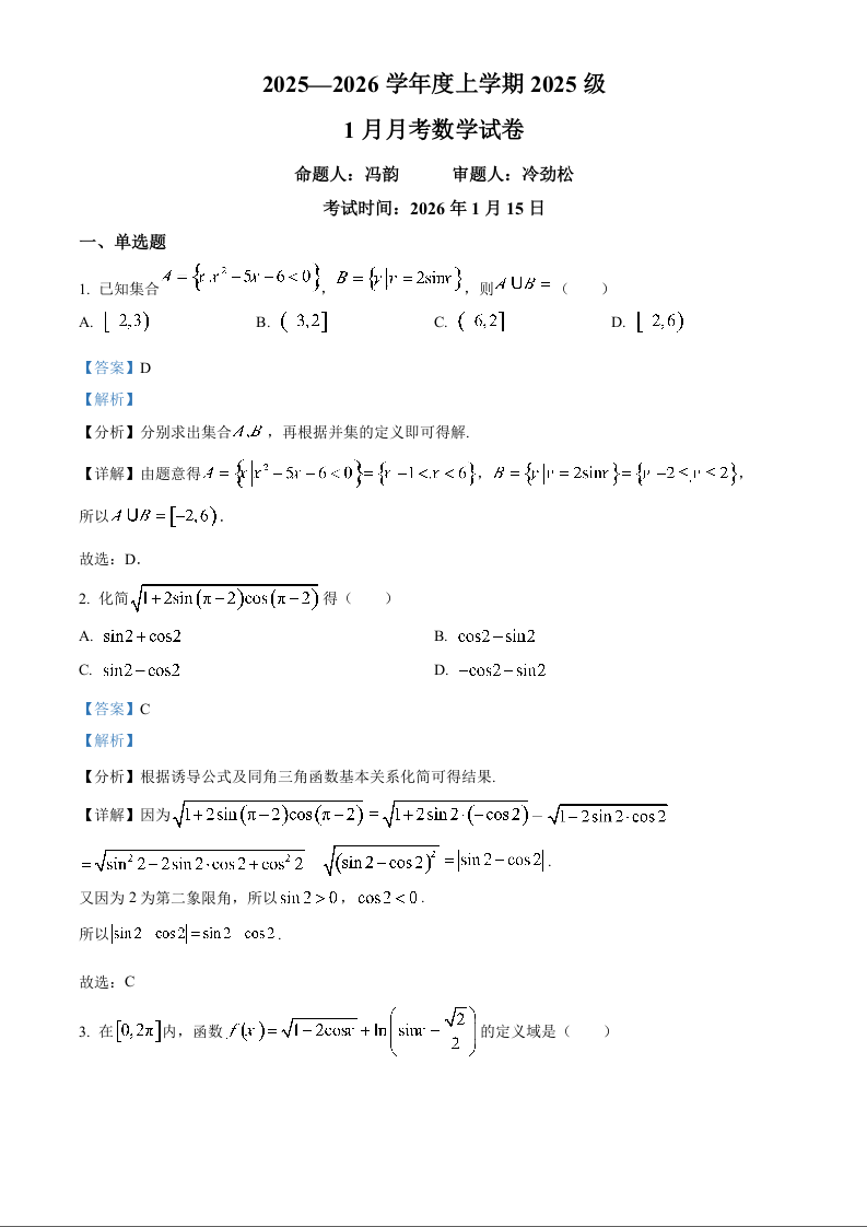 湖北省沙市中学2025-2026学年高一上学期1月月考 数学答案.docx