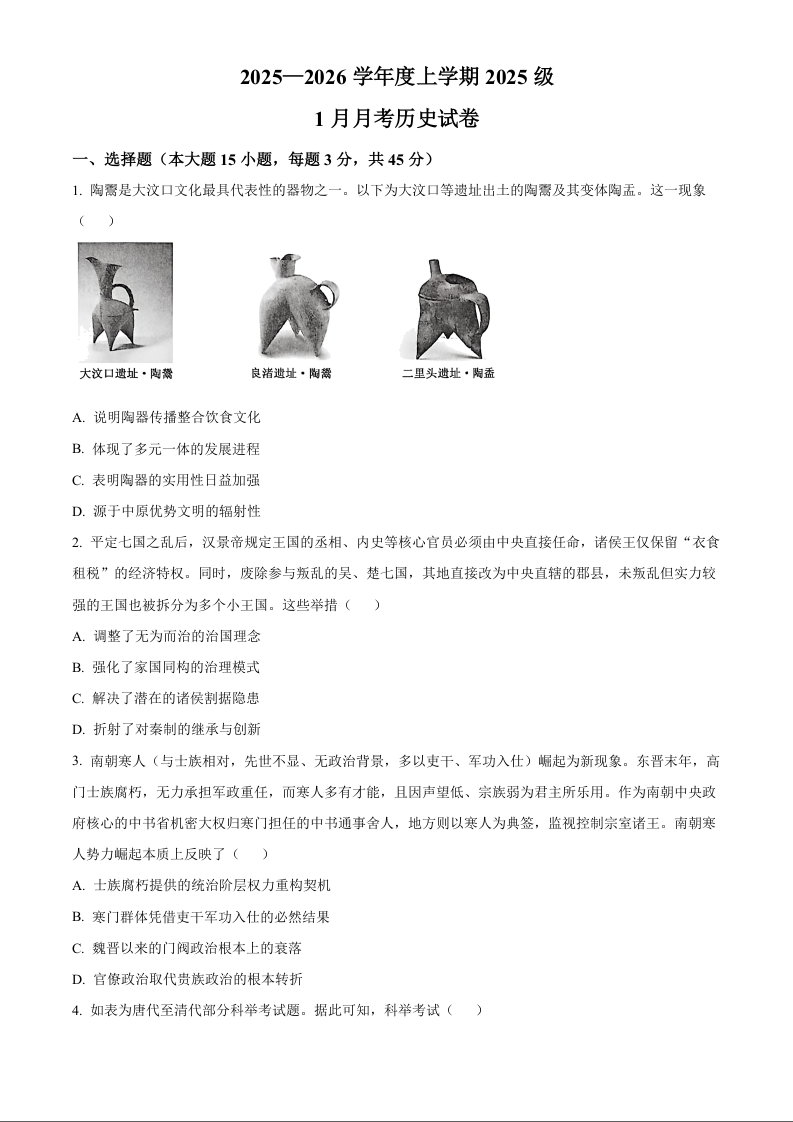 湖北省沙市中学2025-2026学年高一上学期1月月考 历史.docx