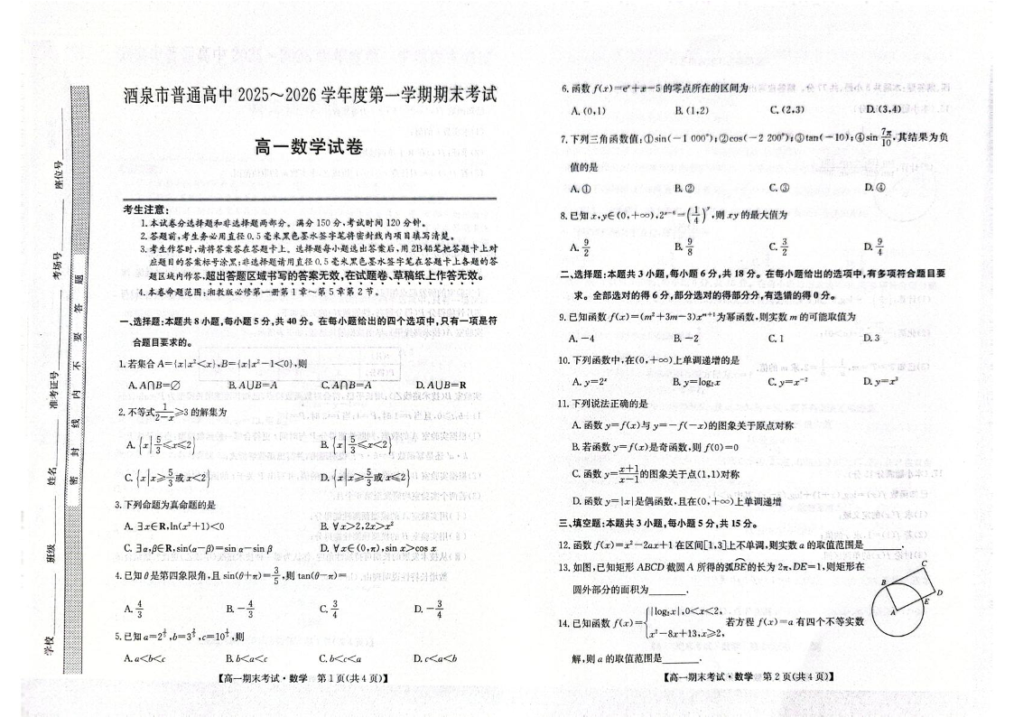 甘肃省酒泉市普通高中2025-2026学年高一上学期1月期末考试 数学试题(含答案).pdf