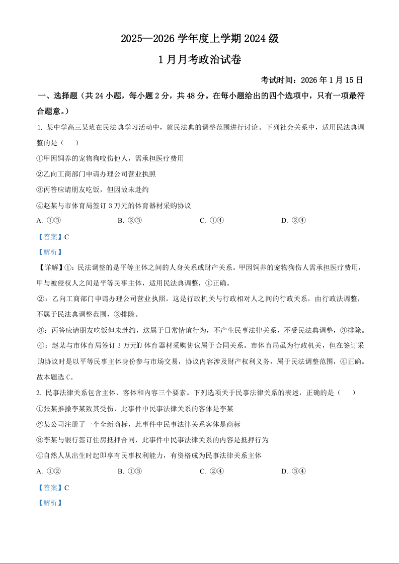 湖北省沙市中学2025-2026学年高二上学期1月月考 政治答案.docx