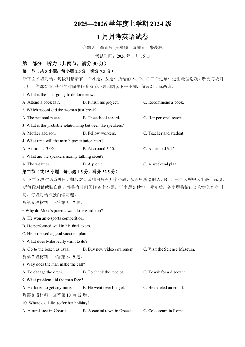 湖北省沙市中学2025-2026学年高二上学期1月月考 英语试题(含答案).docx