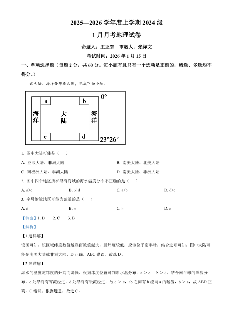 湖北省沙市中学2025-2026学年高二上学期1月月考 地理答案.docx