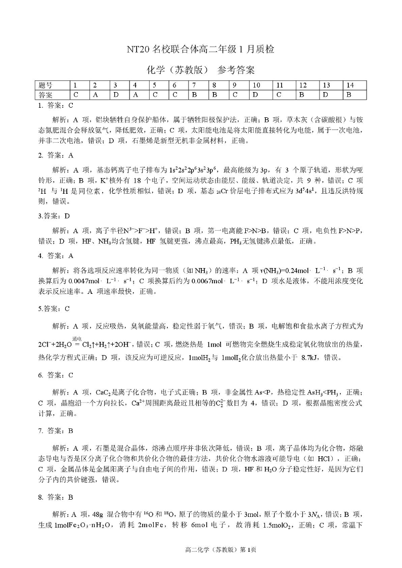 河北省邯郸市NT20名校联合体2025-2026学年高二年级1月质检 化学答案.pdf