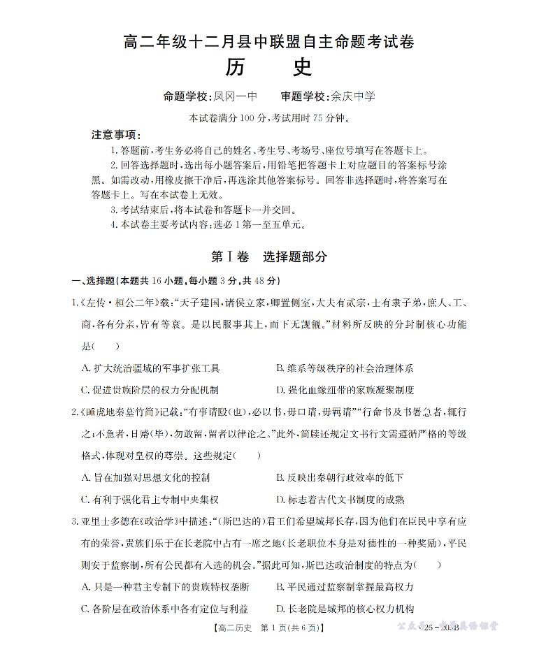 贵州省2025-2026学年高二上学期十二月县中联盟自主命题考试卷 历史.pdf