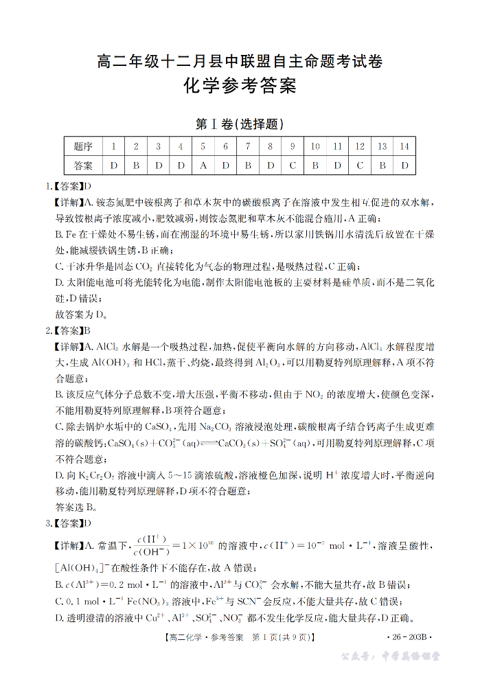贵州省2025-2026学年高二上学期十二月县中联盟自主命题考试卷 化学答案.pdf