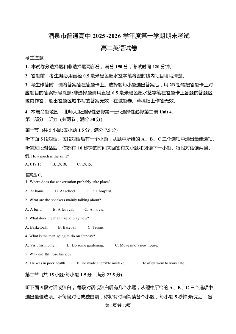 甘肃省酒泉市普通高中2025-2026学年高二上学期1月期末考试 英语试题(含答案).docx