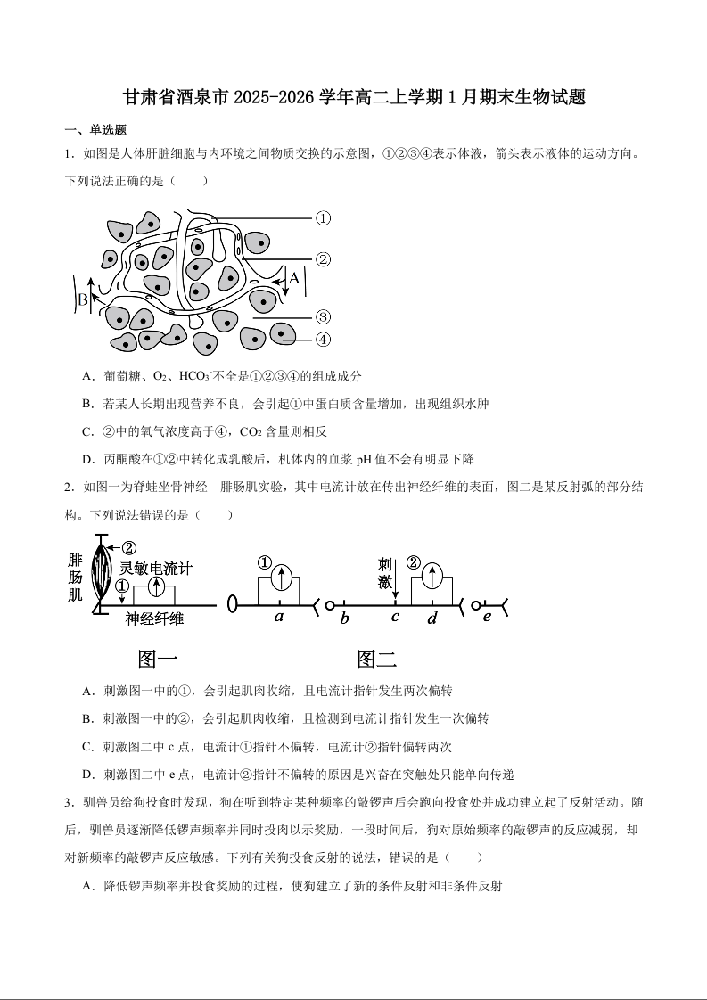 甘肃省酒泉市普通高中2025-2026学年高二上学期1月期末考试 生物试题(含答案).docx