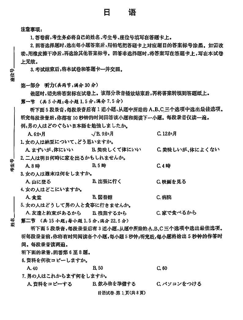 陕西省2026届高三供题训练(一)日语试题.pdf