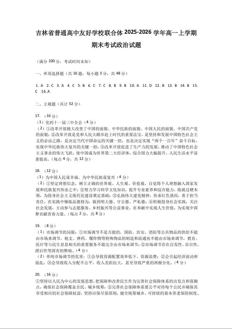 吉林省普通高中友好学校联合体2025-2026学年高一上学期期末考试 政治答案.docx