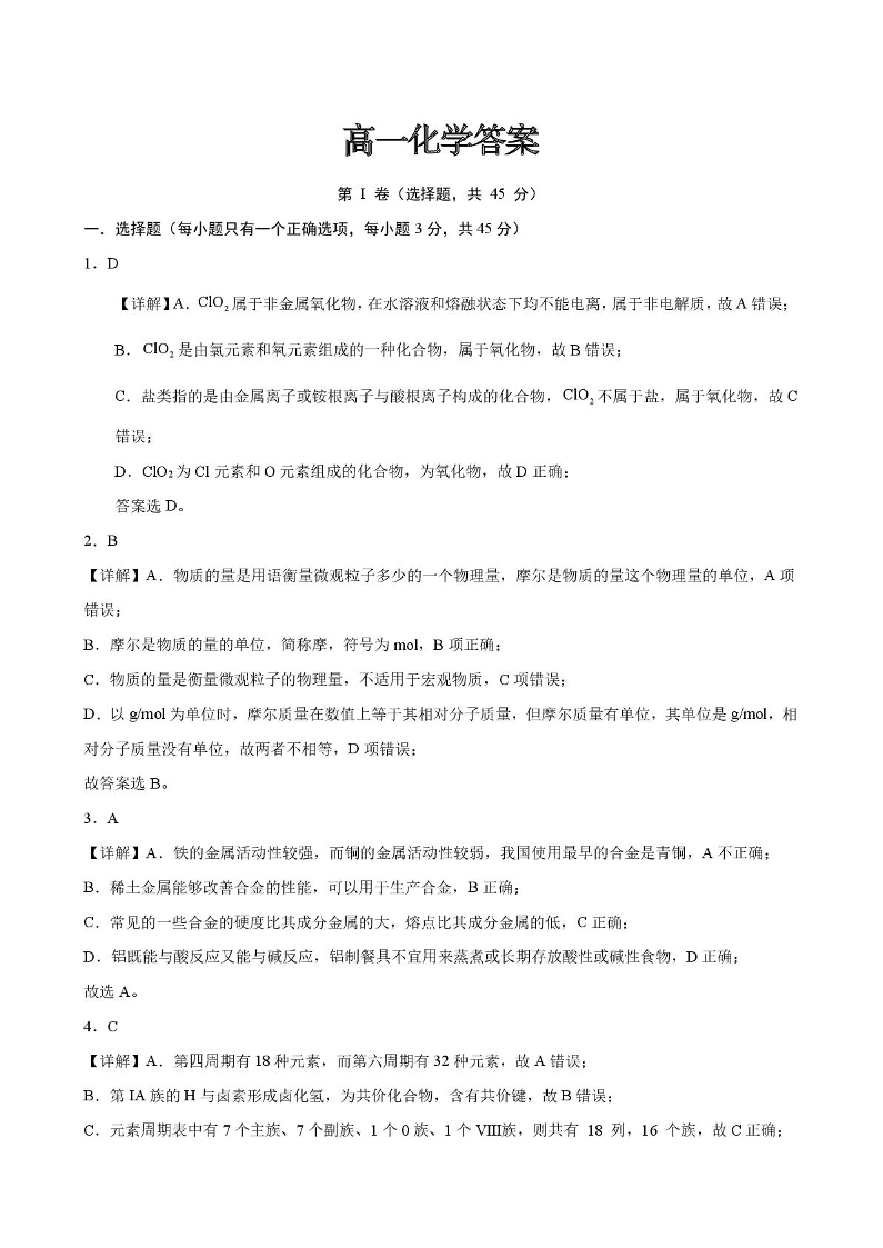 吉林省普通高中友好学校联合体2025-2026学年高一上学期期末考试 化学答案.pdf