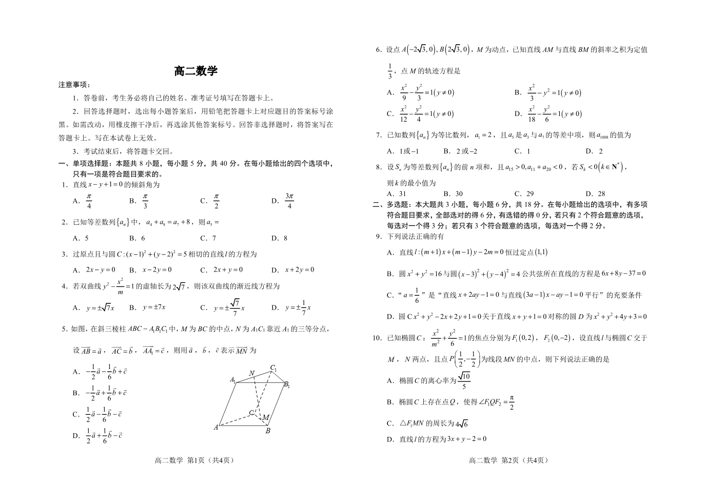 吉林省普通高中友好学校联合体2025-2026学年高二上学期期末联考 数学试题(含答案).pdf