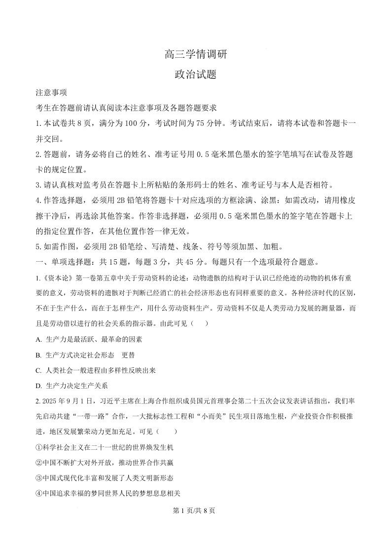 江苏省镇江市四校联考2026届高三上学期1月学情调研 政治.docx