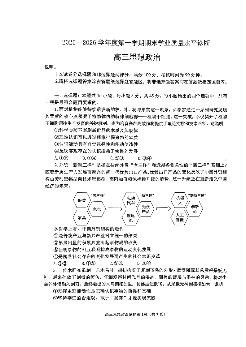 2025—2026学年度第一学期期末学业质量水平诊断 政治试题(含答案).pdf