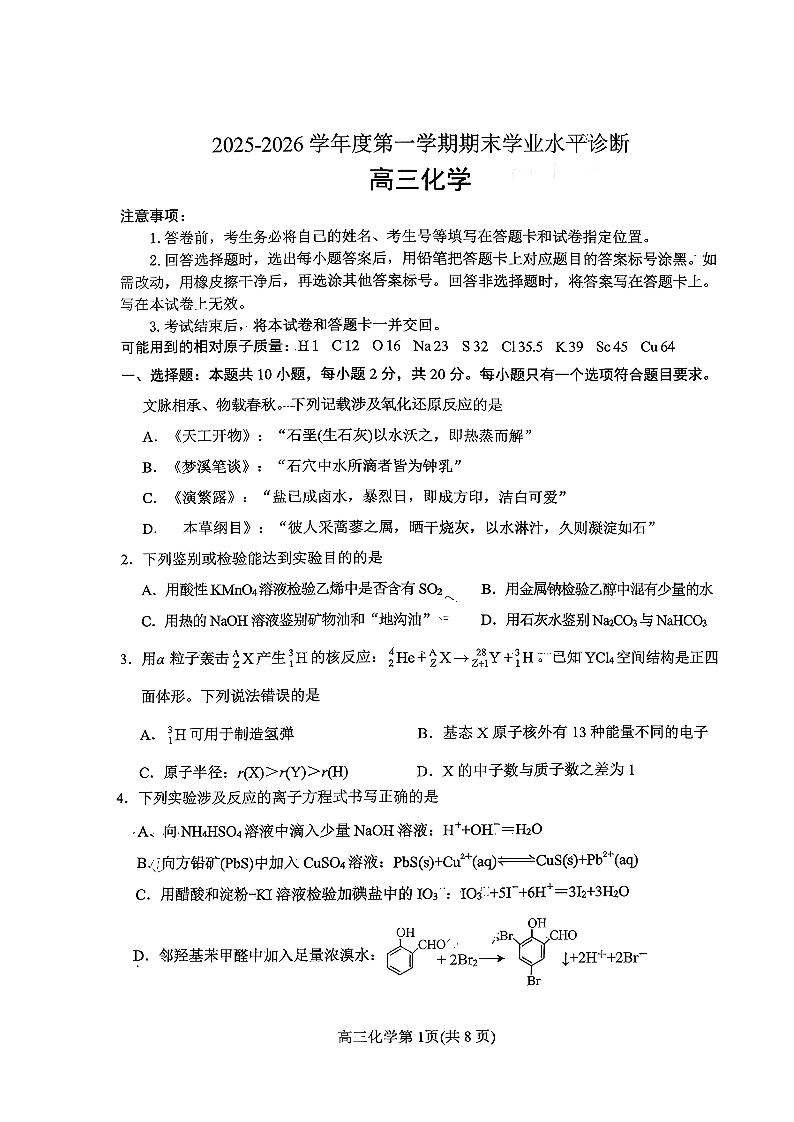 2025—2026学年度第一学期期末学业质量水平诊断 化学试题(含答案).pdf