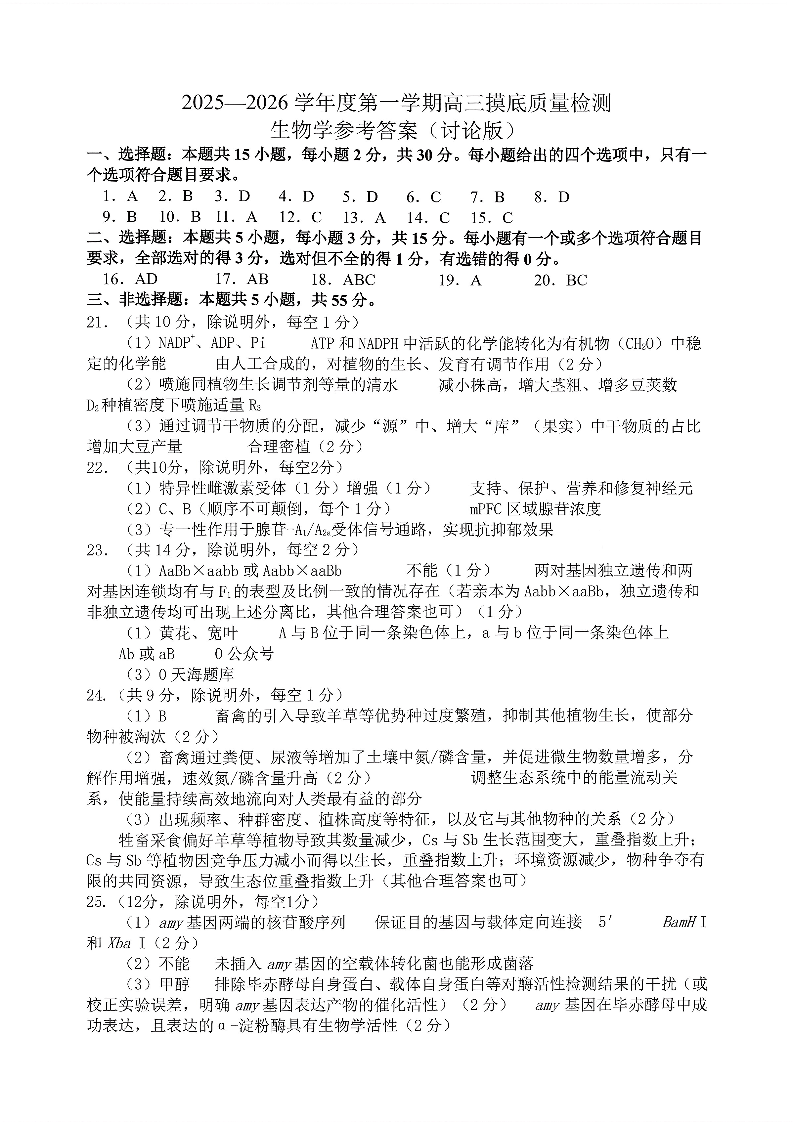 生物答案-2026届山东省淄博市第一学期高三摸底质量检测(期末).pdf