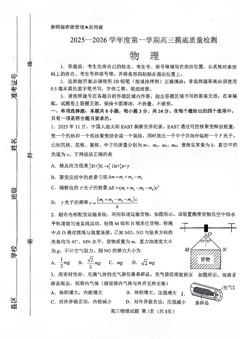 物理试卷-2026届山东省淄博市第一学期高三摸底质量检测(期末).pdf