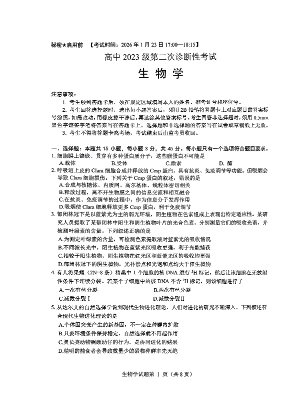 绵阳市高中2023级第二次诊断性考试 生物.pdf