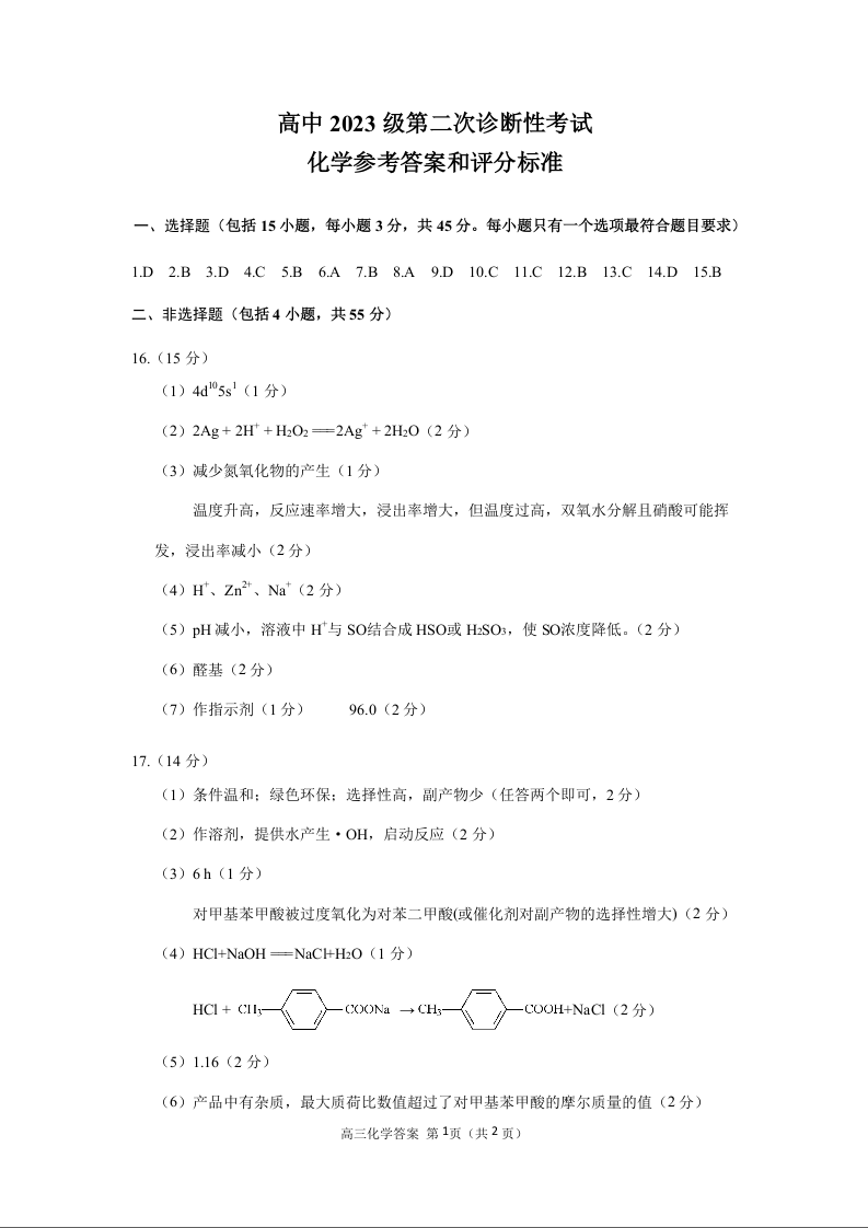 绵阳市高中2023级第二次诊断性考试 化学答案.docx