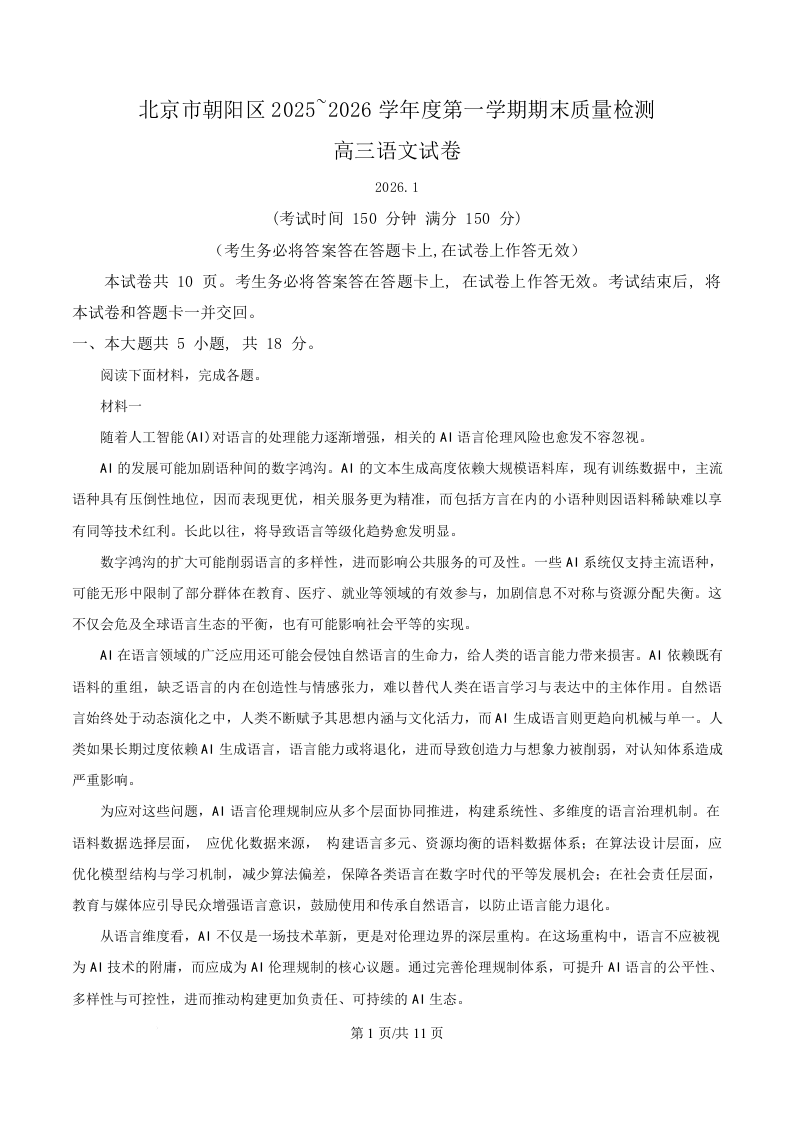 北京市朝阳区2025-2026学年度高三第一学期期末质量检测 语文.docx