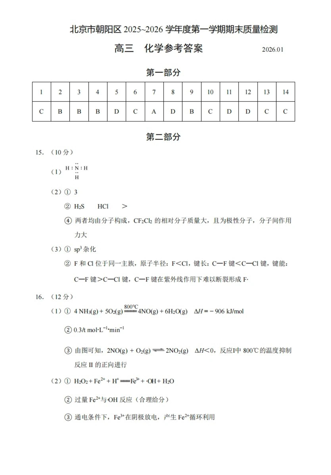 北京市朝阳区2025-2026学年度高三第一学期期末质量检测 化学答案.pdf