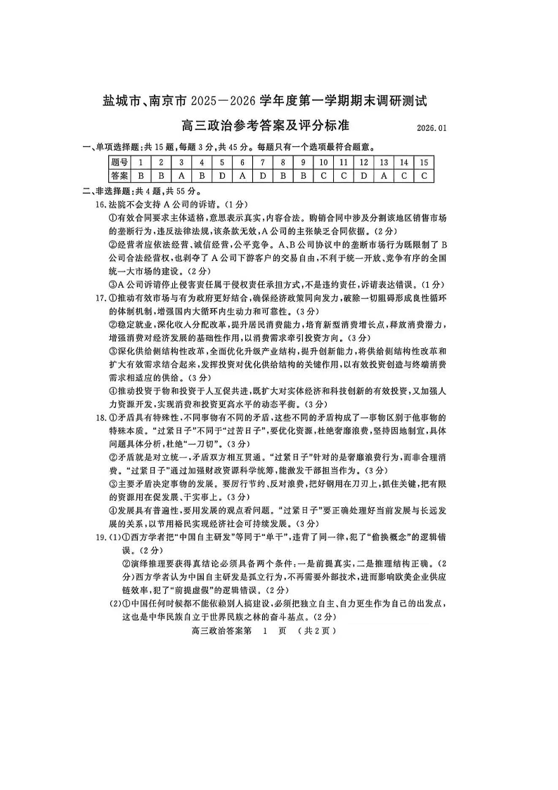 江苏省南京市、盐城市2025-2026学年高三上学期期末调研测试 政治答案.pdf