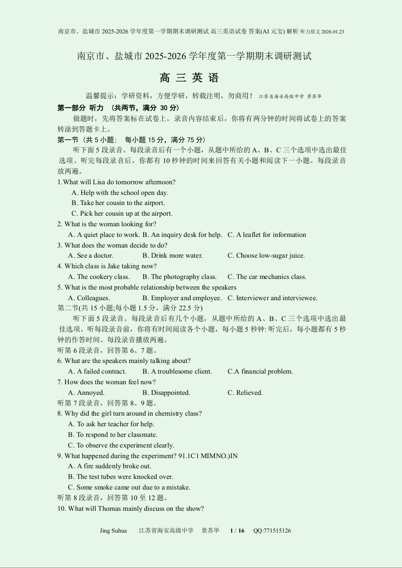 江苏省南京市、盐城市2025-2026学年高三上学期期末调研测试 英语答案.docx