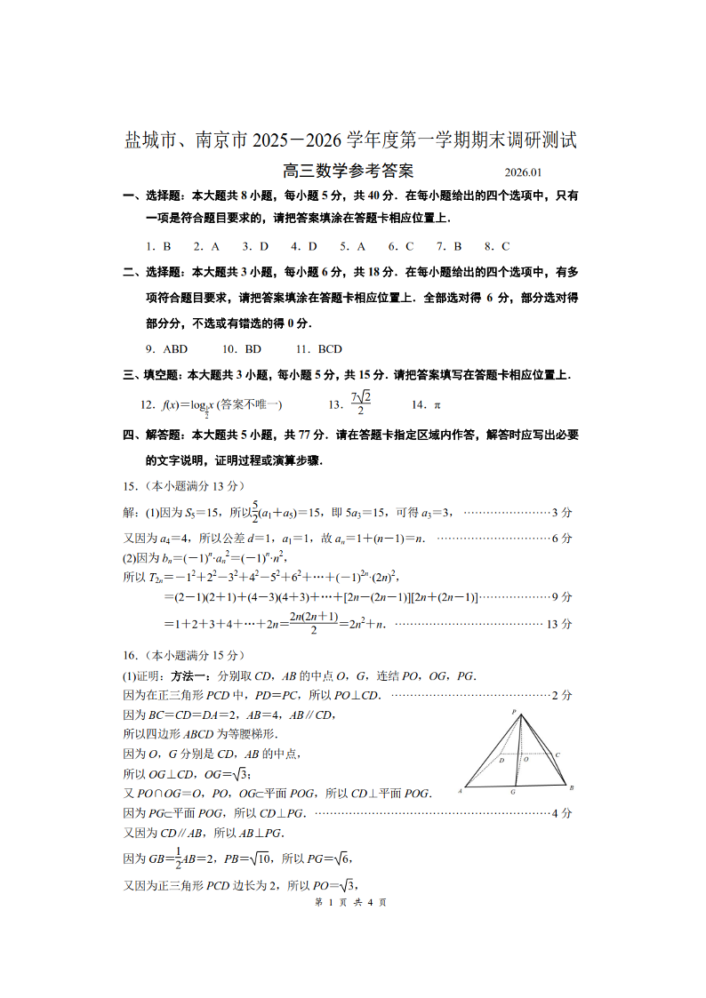 江苏省南京市、盐城市2025-2026学年高三上学期期末调研测试 数学答案.pdf