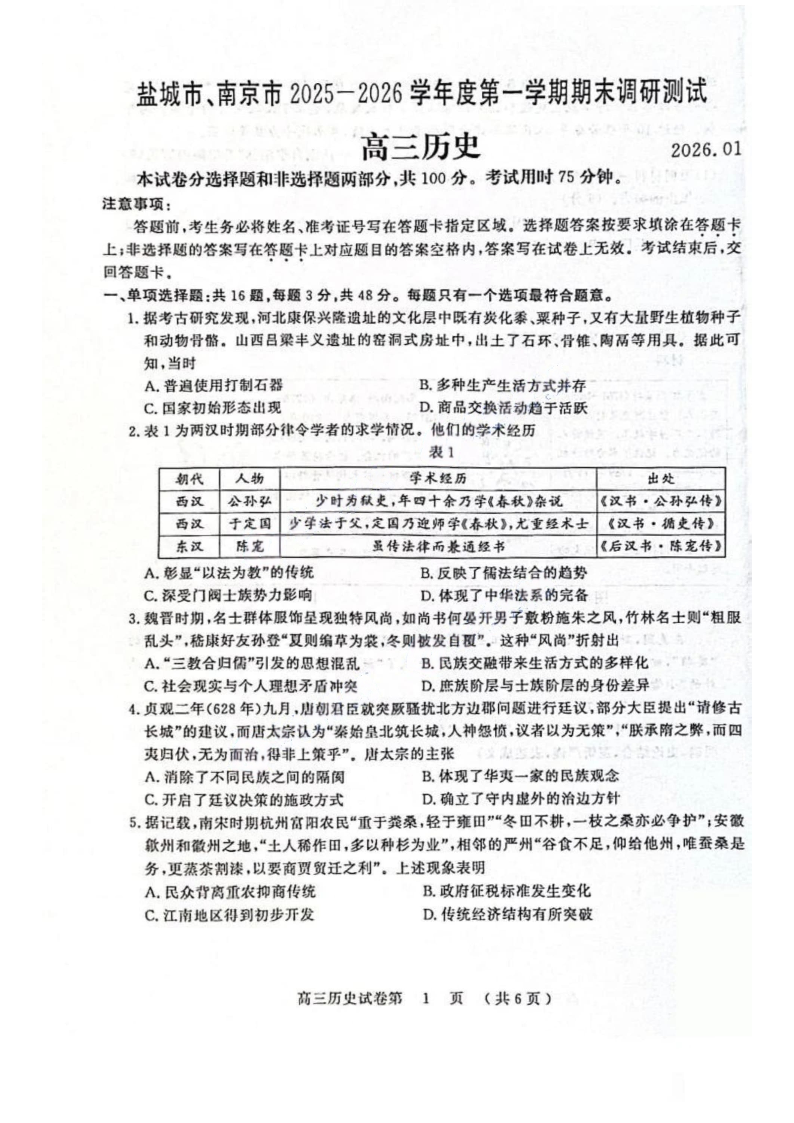 江苏省南京市、盐城市2025-2026学年高三上学期期末调研测试 历史.pdf