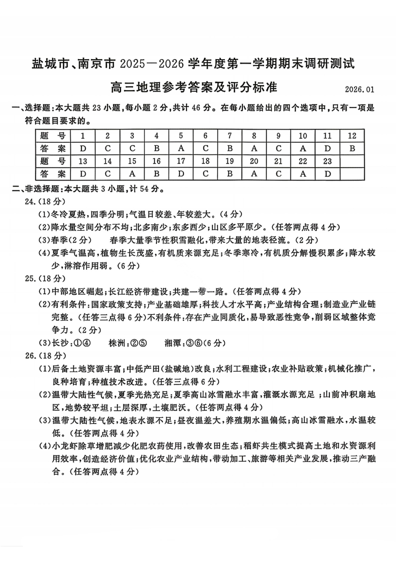 江苏省南京市、盐城市2025-2026学年高三上学期期末调研测试 地理答案.pdf