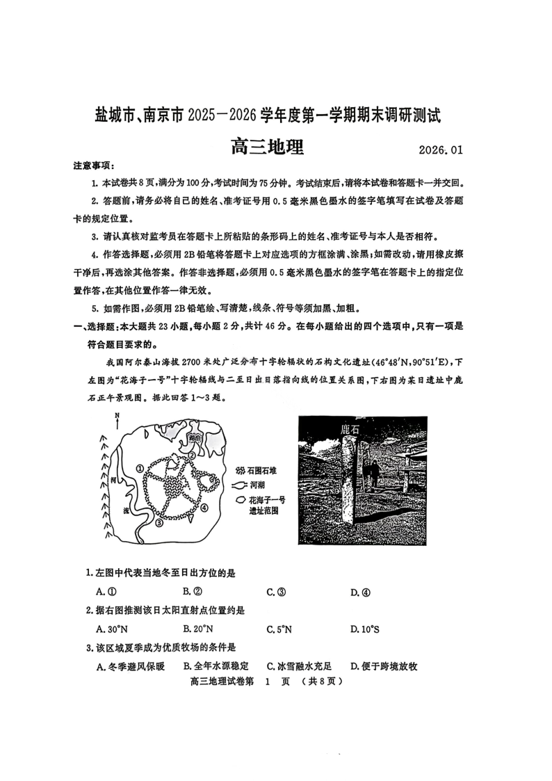 江苏省南京市、盐城市2025-2026学年高三上学期期末调研测试 地理.pdf