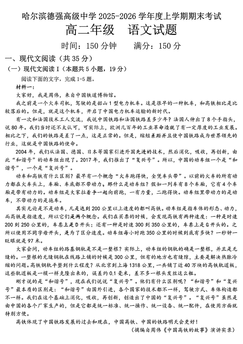 哈尔滨德强高级中学2025-2026学年高二上学期期末考试 语文试题(含答案).pdf
