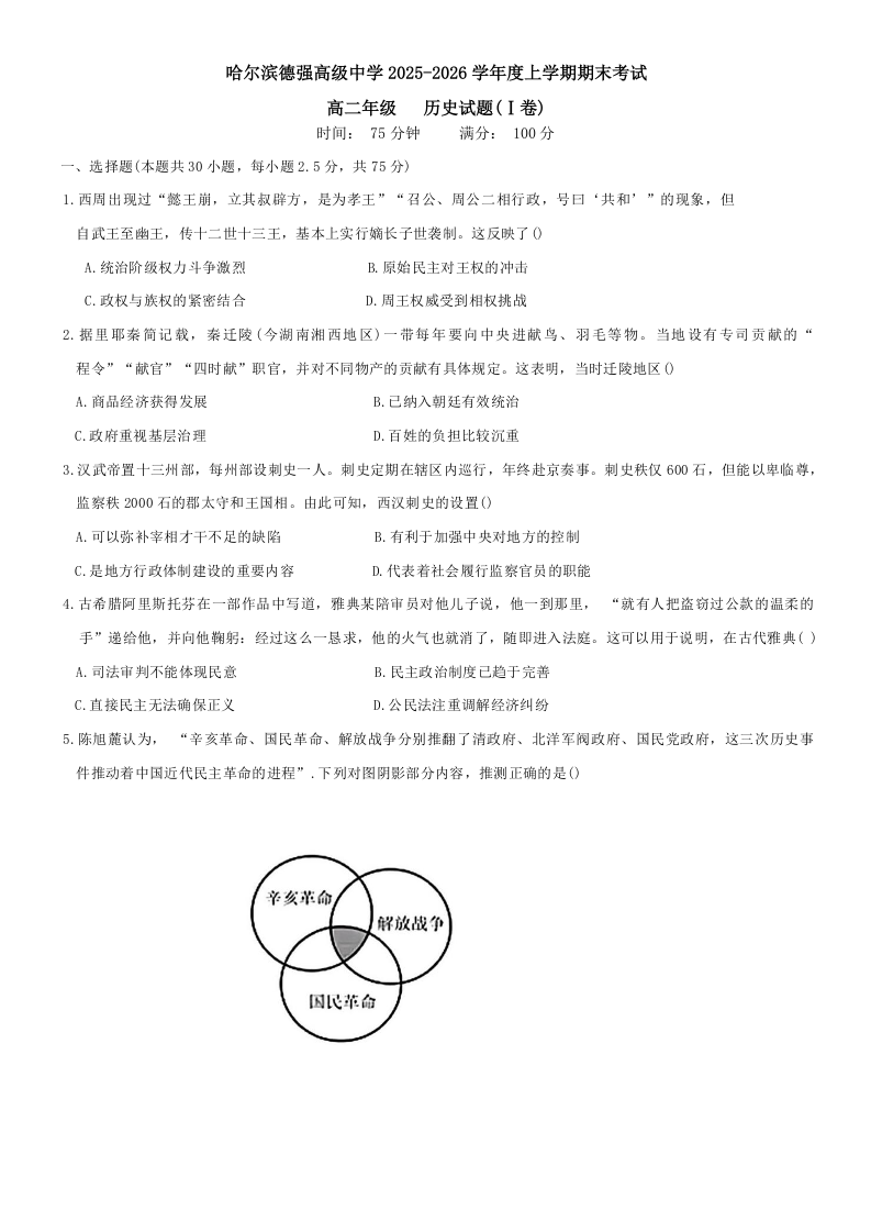 哈尔滨德强高级中学2025-2026学年高二上学期期末考试 历史试题(含答案).docx