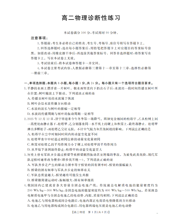 山东省济宁市2025-2026学年高二上学期1月诊断性练习 物理.pdf