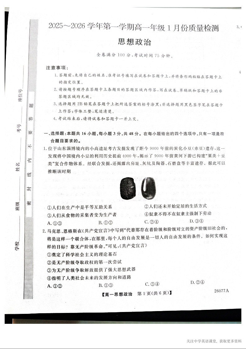 河北省石家庄市七县联合体2025-2026学年高一上学期1月月考 政治.docx