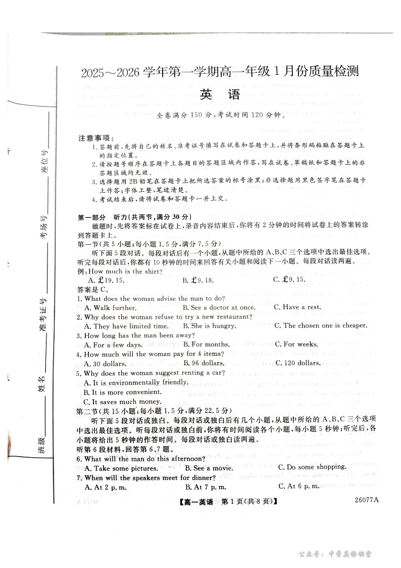 河北省石家庄市七县联合体2025-2026学年高一上学期1月月考 英语试题(含答案).pdf