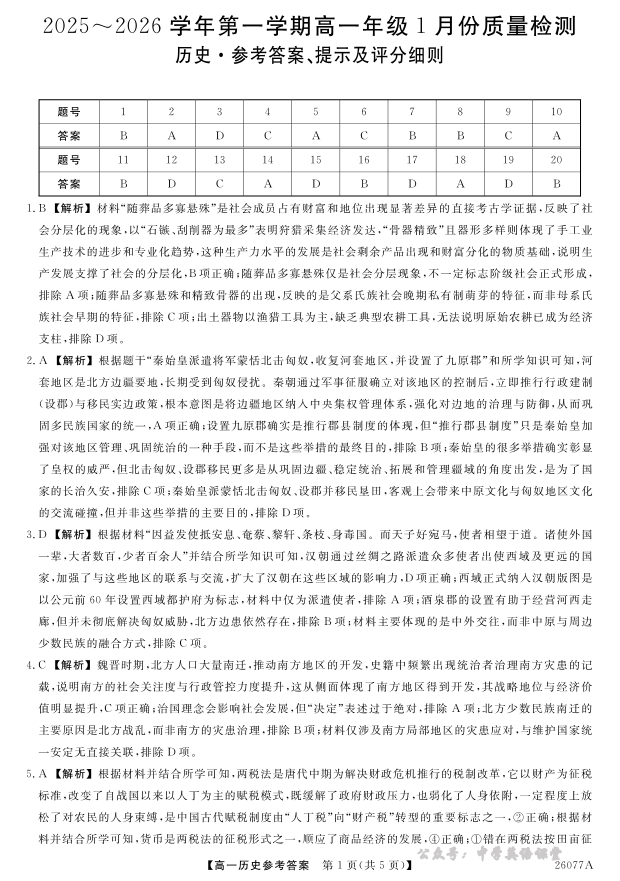 河北省石家庄市七县联合体2025-2026学年高一上学期1月月考 历史答案.pdf