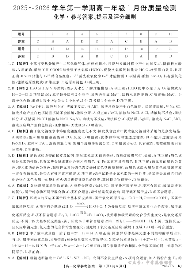 河北省石家庄市七县联合体2025-2026学年高一上学期1月月考 化学答案.pdf